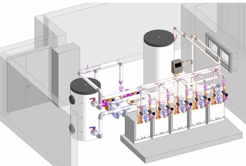 Původní projektová dokumentace, kde byla navržena zvlášť vyroba chladu a tepla jednotlivými čerpadly byla komplentně přepracována tak, aby tepelná čerpadla souběžně vyráběla teplo pro TV (sekundární strana) i chlad (primární strana), čímž se odhadují velké úspory energií.